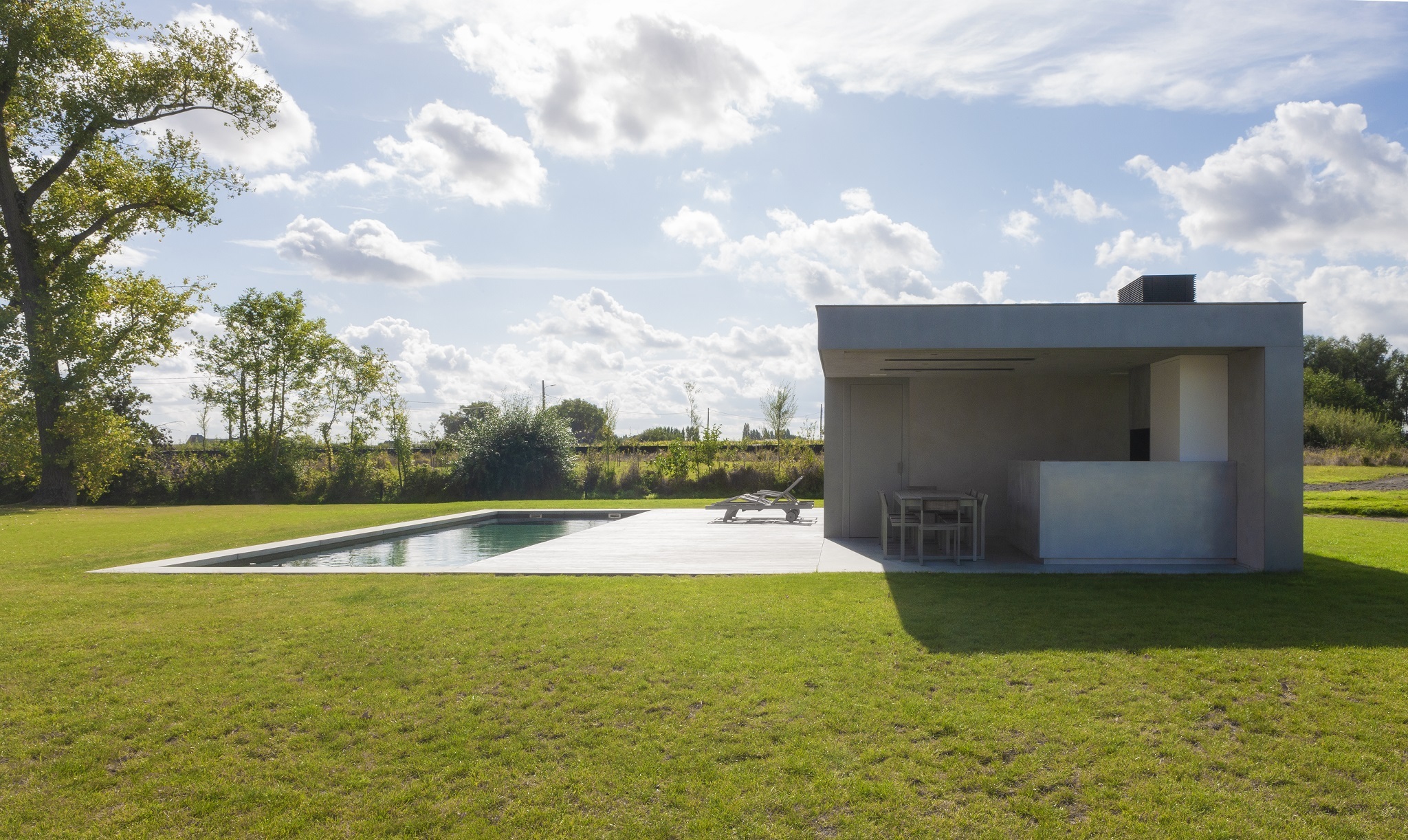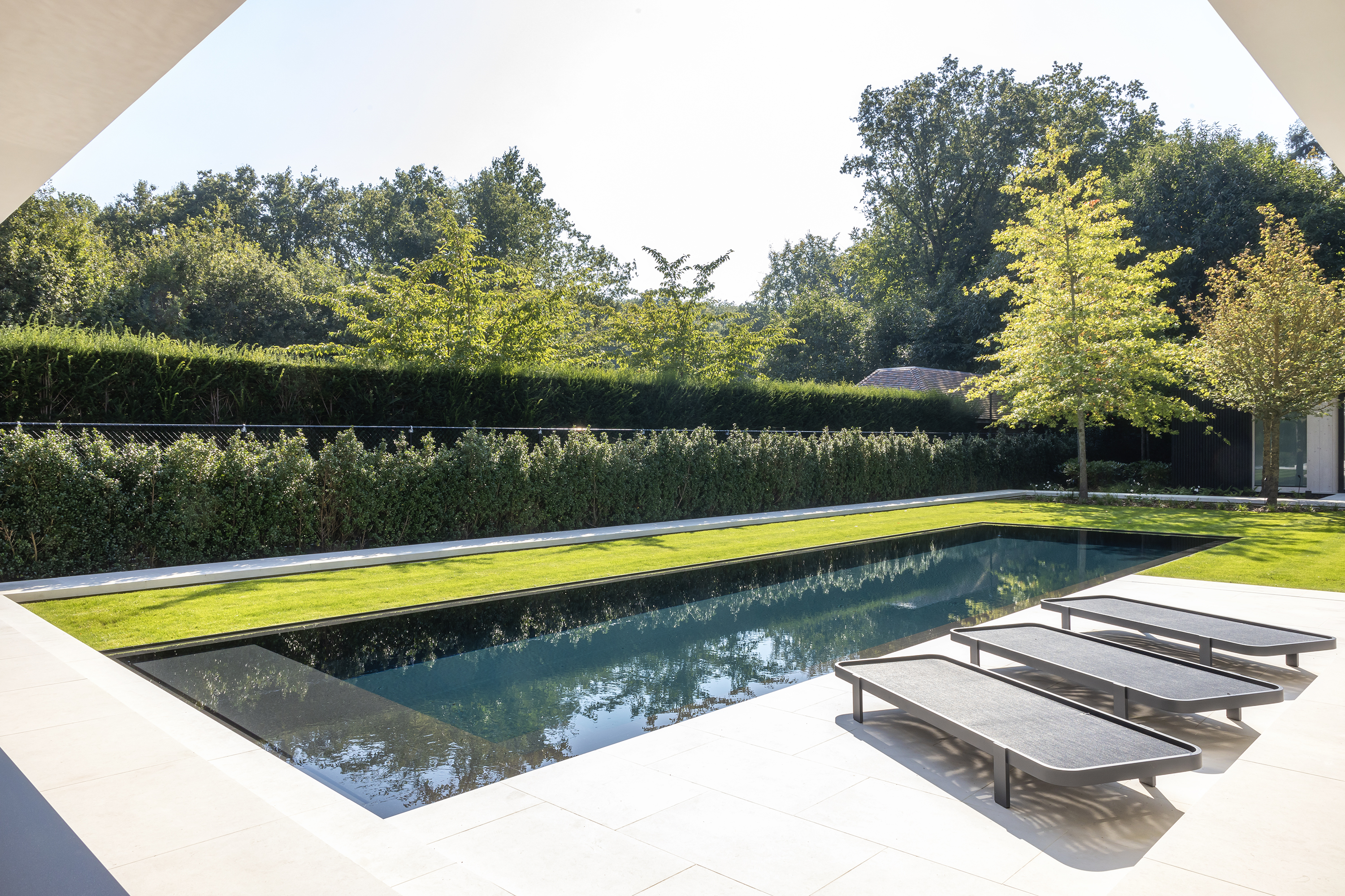 Dit project illustreert hoe een strak, naadloos uitgevoerd zwembad een krachtig contrast kan vormen met een organische tuin. De heldere lijnen en perfect afgewerkte betonplaat rondom het zwembad staan garant voor visuele rust, terwijl het groene eilandje subtiel connectie maakt tussen de strakke geometrie van het water en de natuurlijke vormen rondom. Zo wordt het zwembad zelf een architecturaal element dat de omgeving weet te versterken en de beleving te verdiepen.